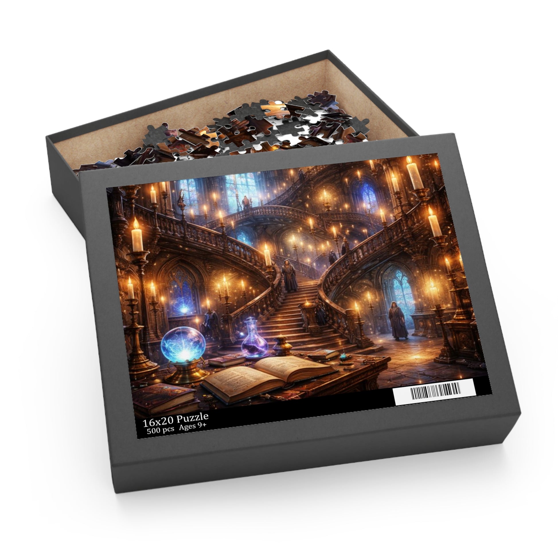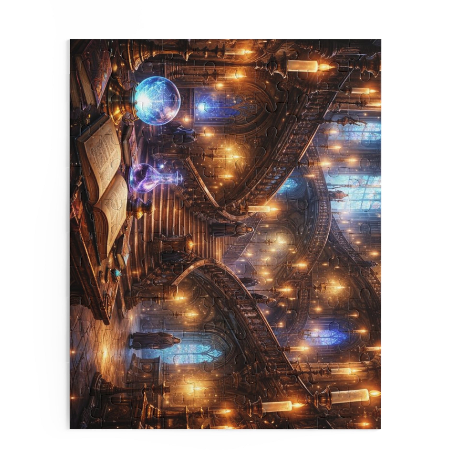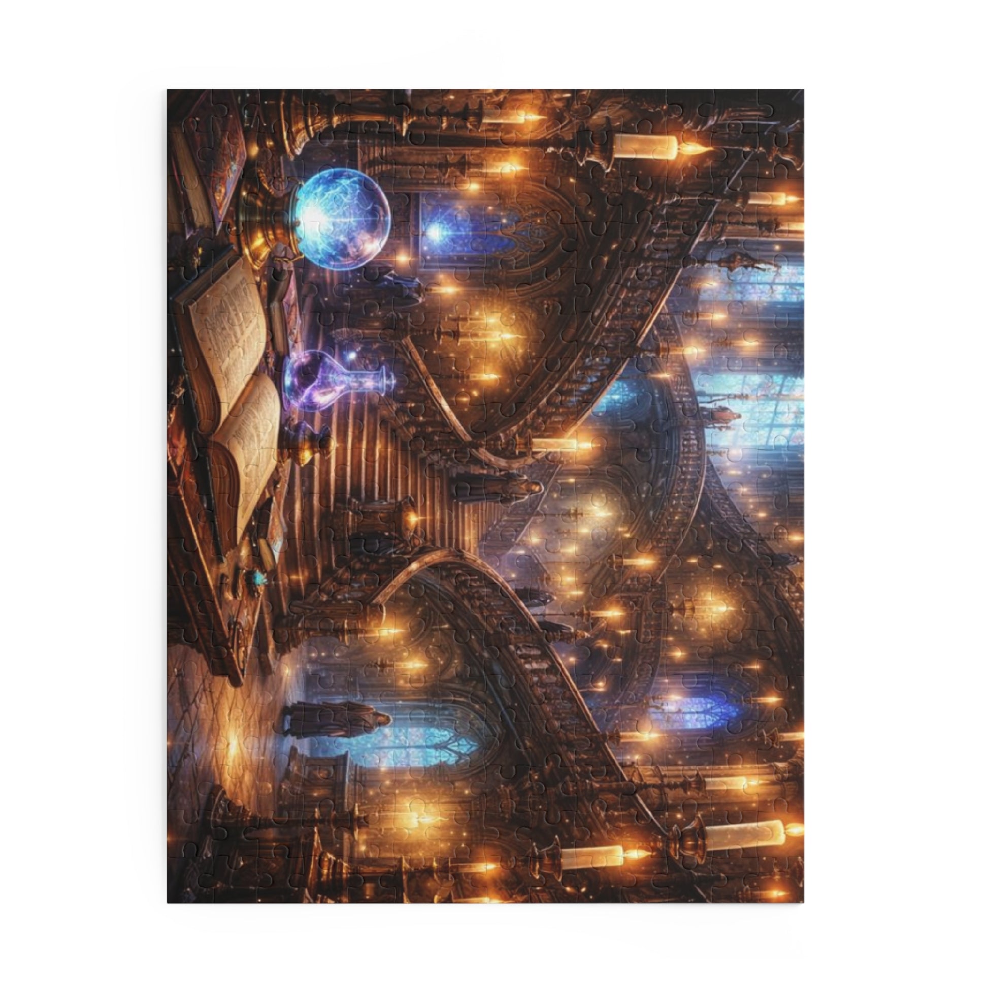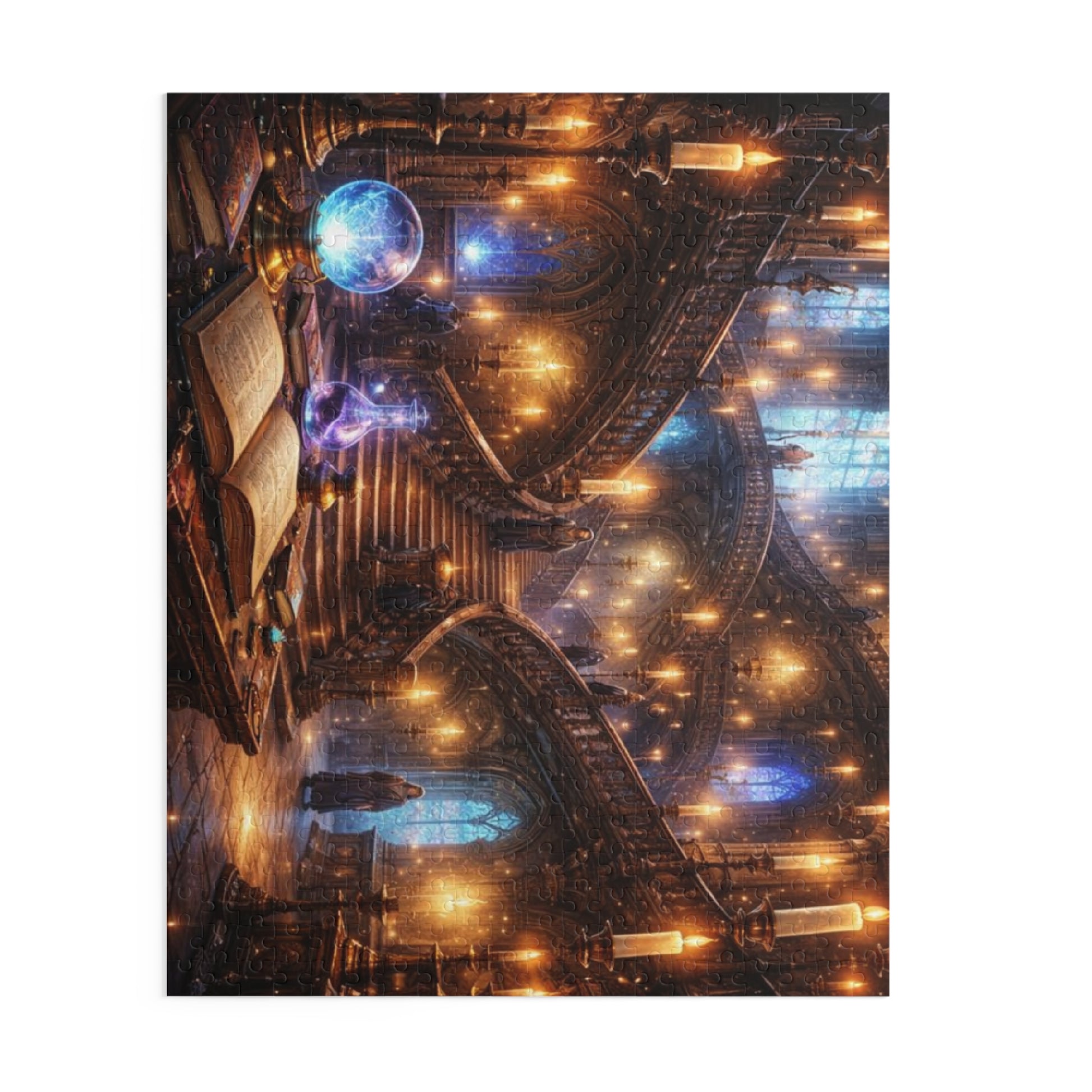 Lose an evening to a room that feels alive. This art puzzle recreates a candlelit, vaulted library where staircases spiral through pools of warm light, crystal orbs hum with soft blue energy, and an open grimoire waits on a worn wooden table. Each piece snaps into thick chipboard with a glossy finish so the glowing highlights and subtle details stay luminous as you build. It’s for anyone who loves slow, focused craft — those who collect strange maps, study old stories, or just want a calm, immersive project to return to after a long day. Arrange the 120, 252, or 500 pieces, watch the scene assemble, and let the room’s hush settle in — like stepping into a story you can touch.